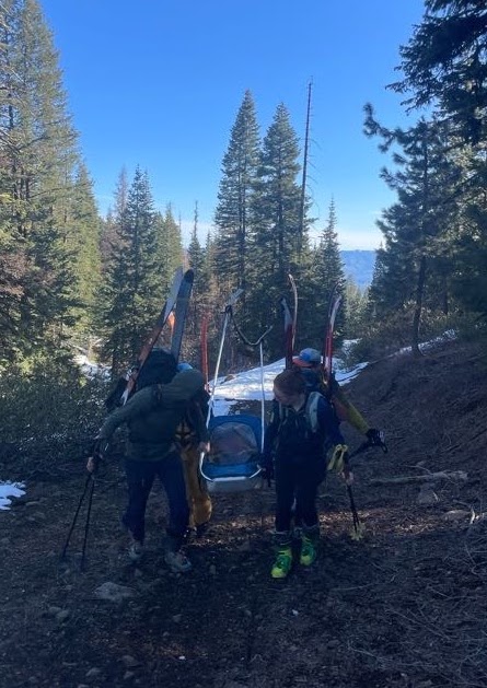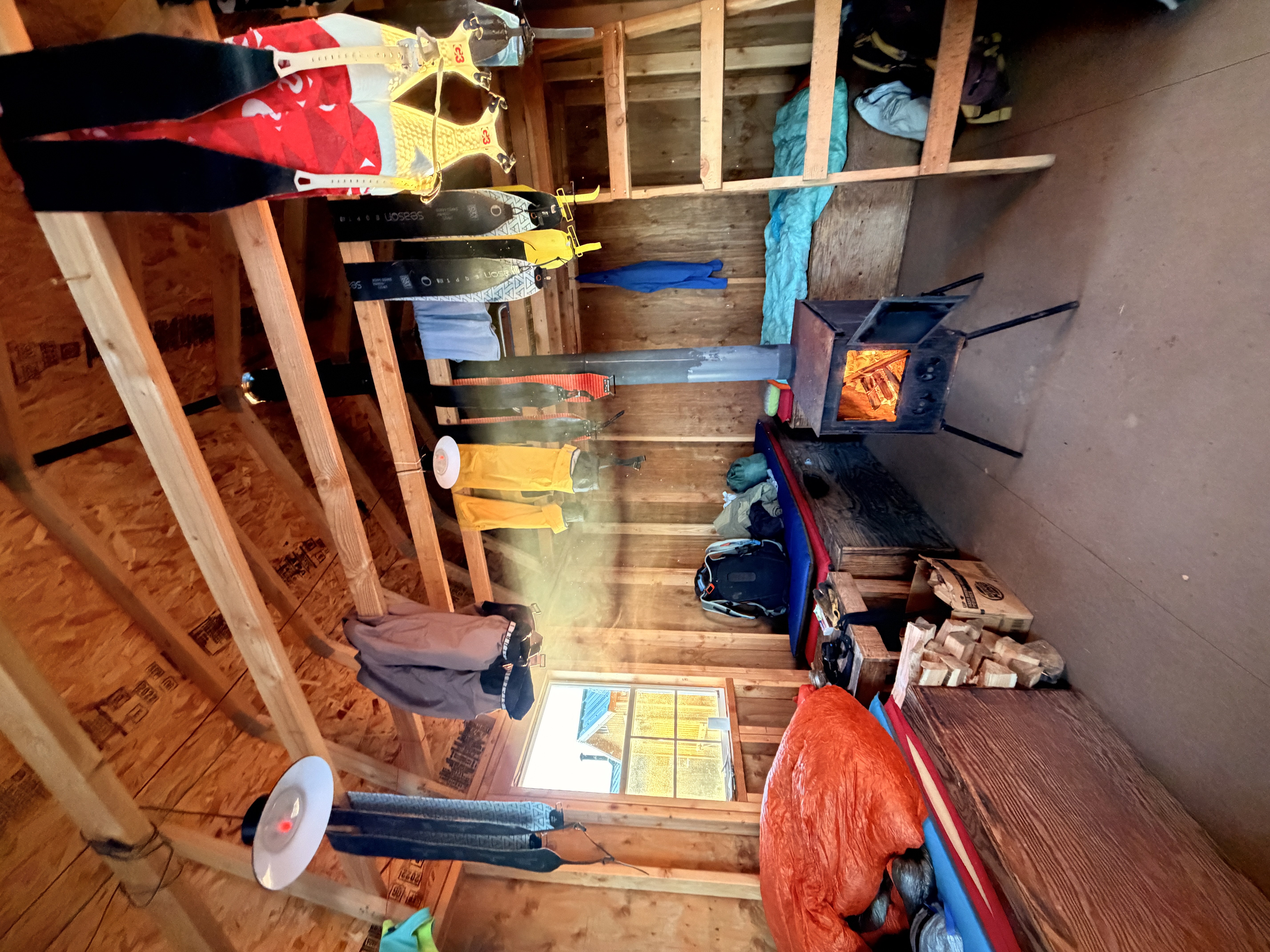 We were told that the snow line started right after the parking area to skin up to Cornucopia Hut and it was about a mile hike, but repeatedly had to strip off our skis and carry pulks with food and other supplies up patches of dirt. The trek wound up being over 2 miles with 1000ft elevation gain and it took almost 3 hours with the repeated stops to attach skis to our backs and carry the gear. Definitely would have been smarter to pack large backpacking bags and carry an empty day pack for touring if we had known the conditions would be this bad, but we eventually made it and started to get settled in.