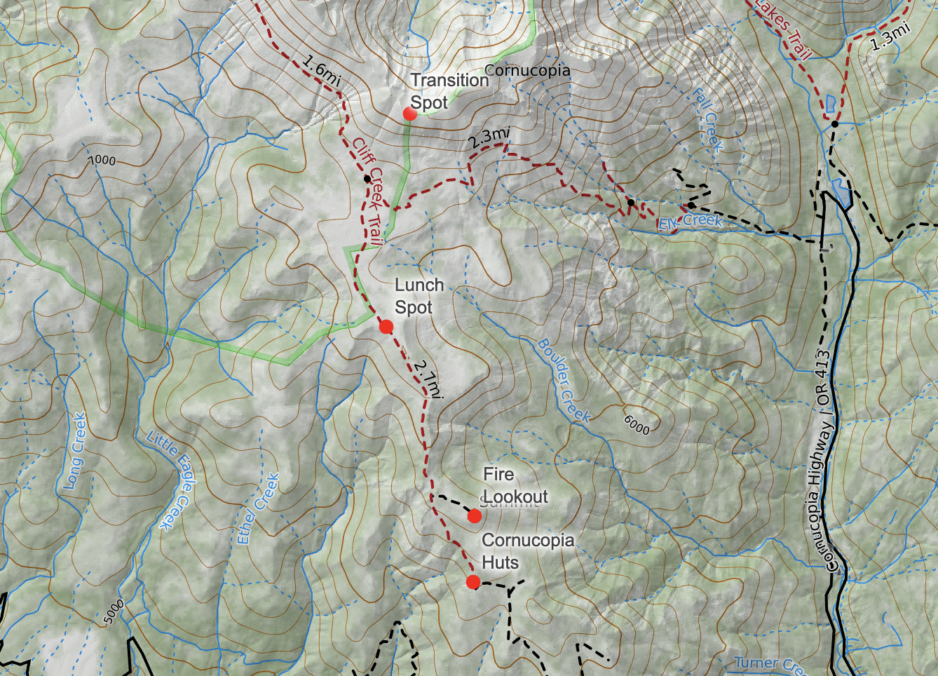 The next morning started at 7am with pancakes and eggs before packing for the day and beginning our skin up at around 9. The morning was cloudier than expected, which was in some ways a relief after the punishing sun reflecting off the snow the day before, but also meant the snow stayed icy due to the recent thaw-freeze cycles. We followed the previous day's line up to the ridge/plateau beneath Cornucopia peak, skipping the detour to the fire lookout. After chatting with the group, we chose a line to ascend to Cornucopia's ridge and hopefully enjoy some spring snow turns on the way down.
