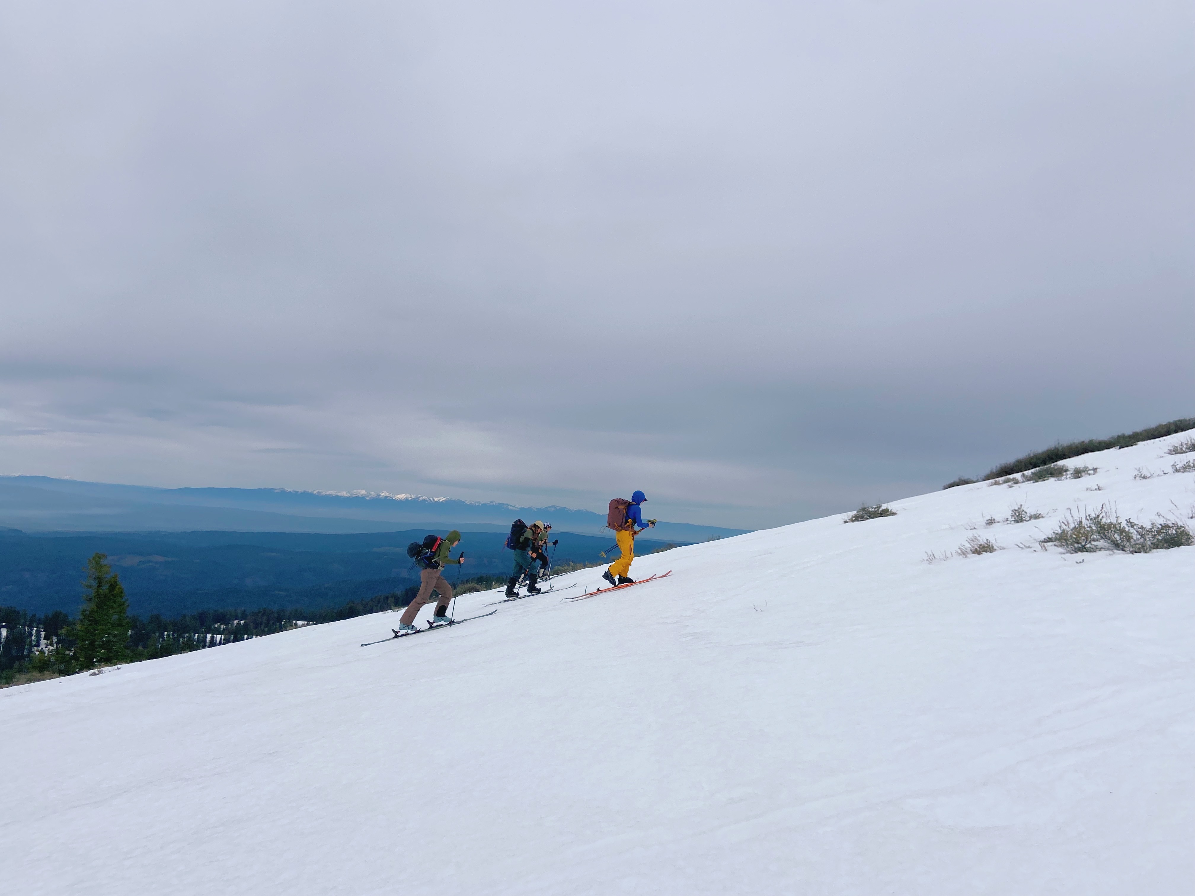 We pushed off from the ridge and swooped down along the face of the mountain. By this point the warm temperatures had turned the snow into something between corn and slush and the sun was peaking out from behind the clouds. Letting out unintelligible whoops and yells, we wove around each other in a dance and laughed as we sprayed snow behind us with each turn. Touring is absolutely a labor of love where you put in 4-5x the amount of time climbing as you do getting to ski down, and you bet we were enjoying every moment of the payoff.