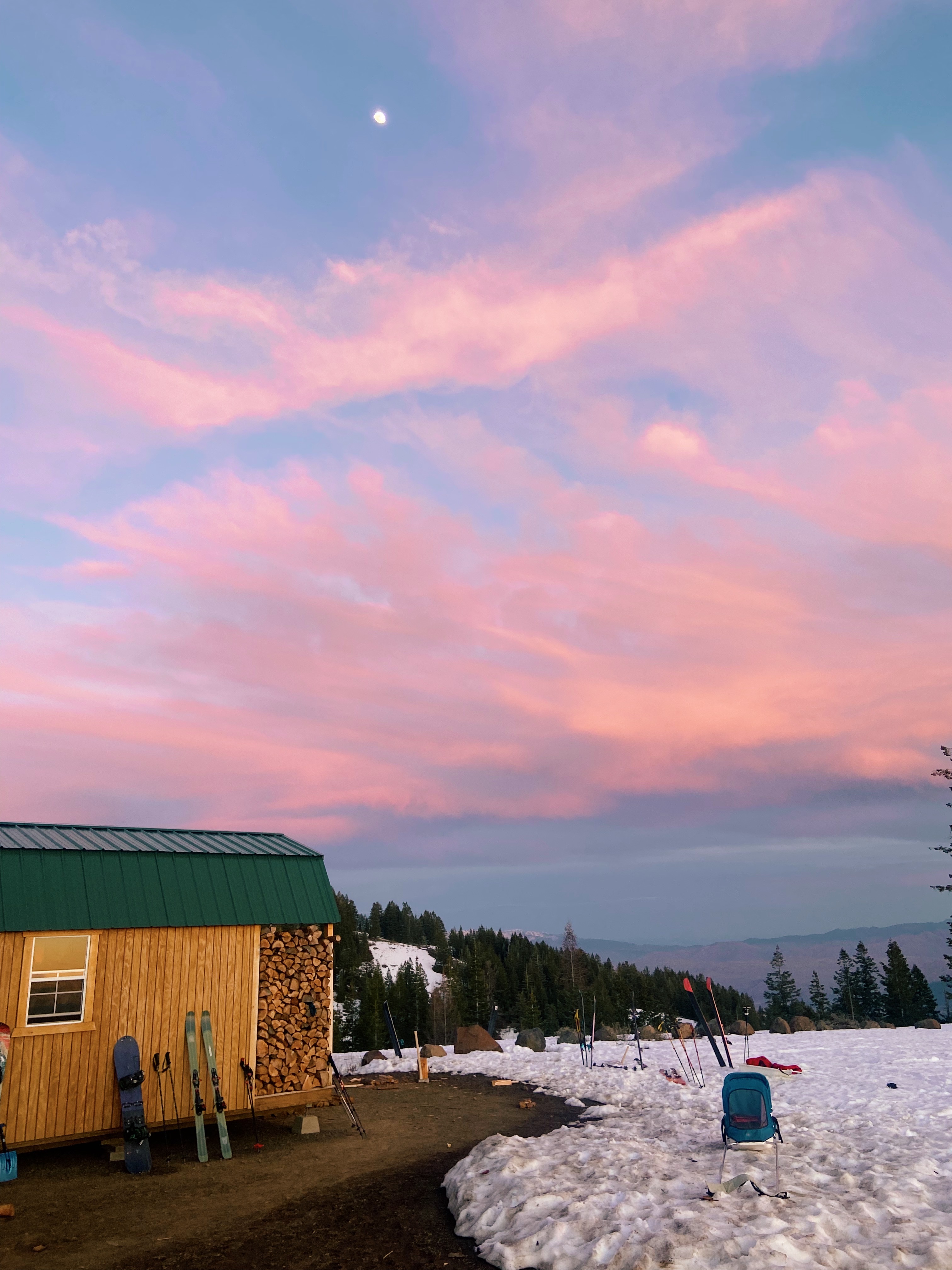 At the bottom, we stopped for lunch on the plateau before skinning up a bit and then half traversing, half skiing back down to the huts while dodging patches of dirt and vegetation that had revealed themselves in the sun over the last few days. We ended with some more runs at our kicker and sat outside reading in shorts before the sun got lower and the wind kicked in, prompting us to move inside for the night. We cooked up tacos for dinner and because there wasn't space in the huts for card games, hung out and talked and played around with kazoos we had found inside. Sunset hit with spectacular colors due to the increased cloud cover and we sipped hot toddies while enjoying the glow.